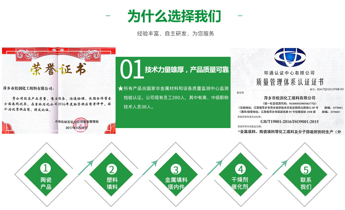 - 萍鄉(xiāng)市松潤化工填料有限公司位于江西省萍鄉(xiāng)市國家經(jīng)濟(jì)開發(fā)區(qū)西區(qū),是專業(yè)生產(chǎn)、經(jīng)營陶瓷、聚丙烯、金屬填料、塔內(nèi)件、水處理濾板、濾管、濾料、瓷球、分子篩、催化劑、活性炭、蜂窩陶瓷、瓷質(zhì)耐磨托輥等系列產(chǎn)品的民營企業(yè)。所有產(chǎn)品由國家非金屬材料和設(shè)備質(zhì)量監(jiān)測(cè)中心監(jiān)測(cè)檢驗(yàn)認(rèn)證。公司現(xiàn)有員工280人,其中有高、中級(jí)職稱技術(shù)人員36人。工藝先進(jìn),技術(shù)力量雄厚,產(chǎn)品質(zhì)量可靠,配... ...